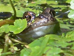 To your left is a frog I photographed a few weeks back popping his head out from between the pennywort in my pond. |