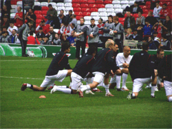 On the right now is a selection of Manchester United players warming up before taking on the Italian side A C Milan in the recent champions league semi final first leg at Old Trafford. United won 3-2 after having trailed 2-1 at one time. I usually go 3 or 4 times a season over to Manchester to watch them in action